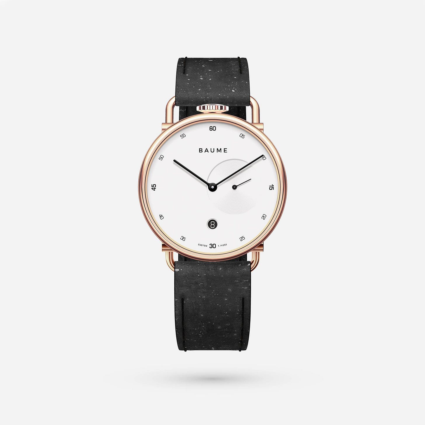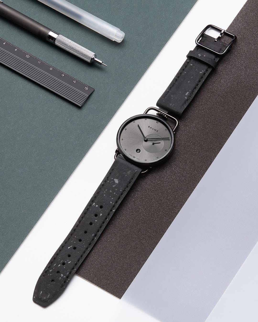 Within the range of environmentally friendly materials, BAUME has recently begun to use cork leather straps in different colors.