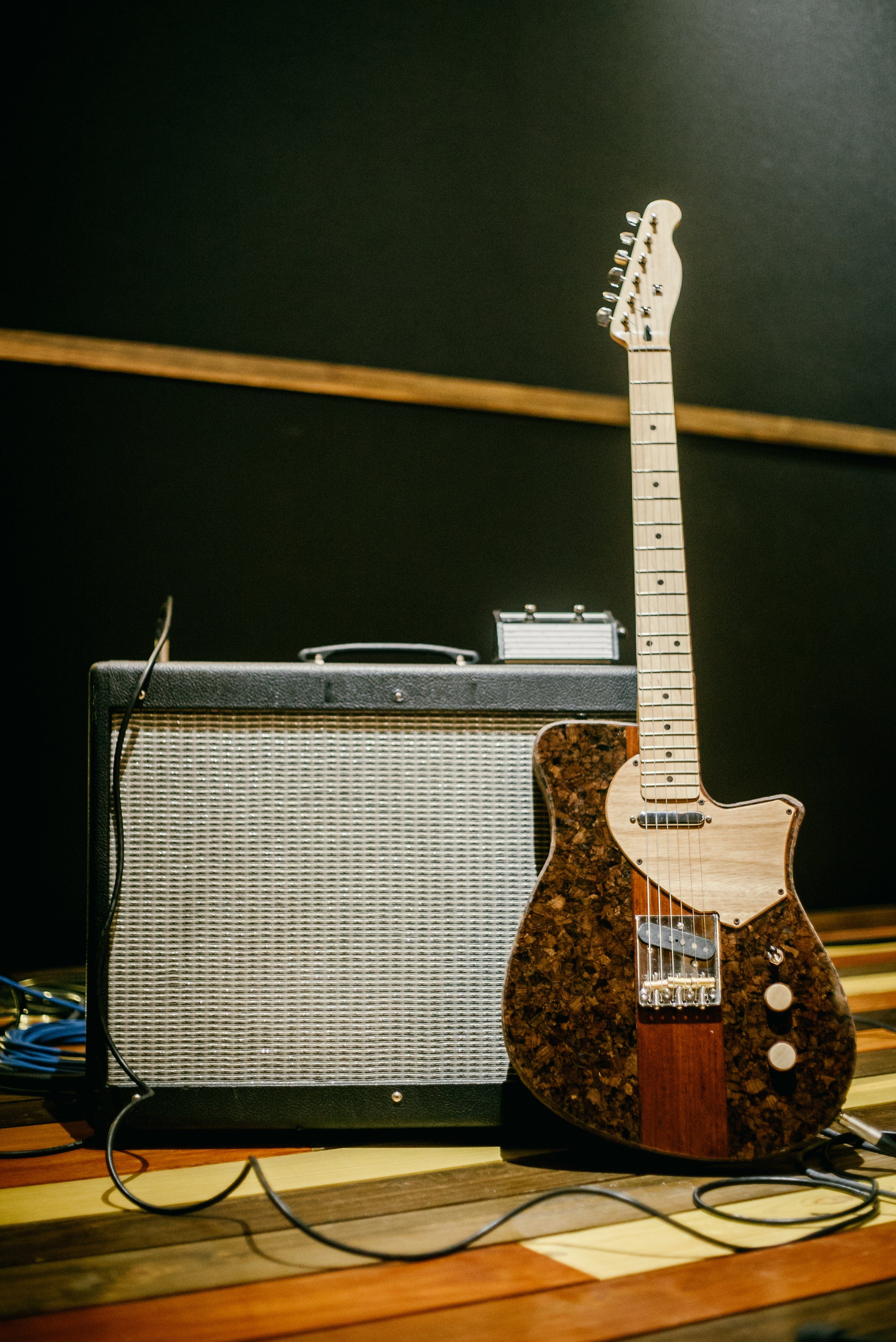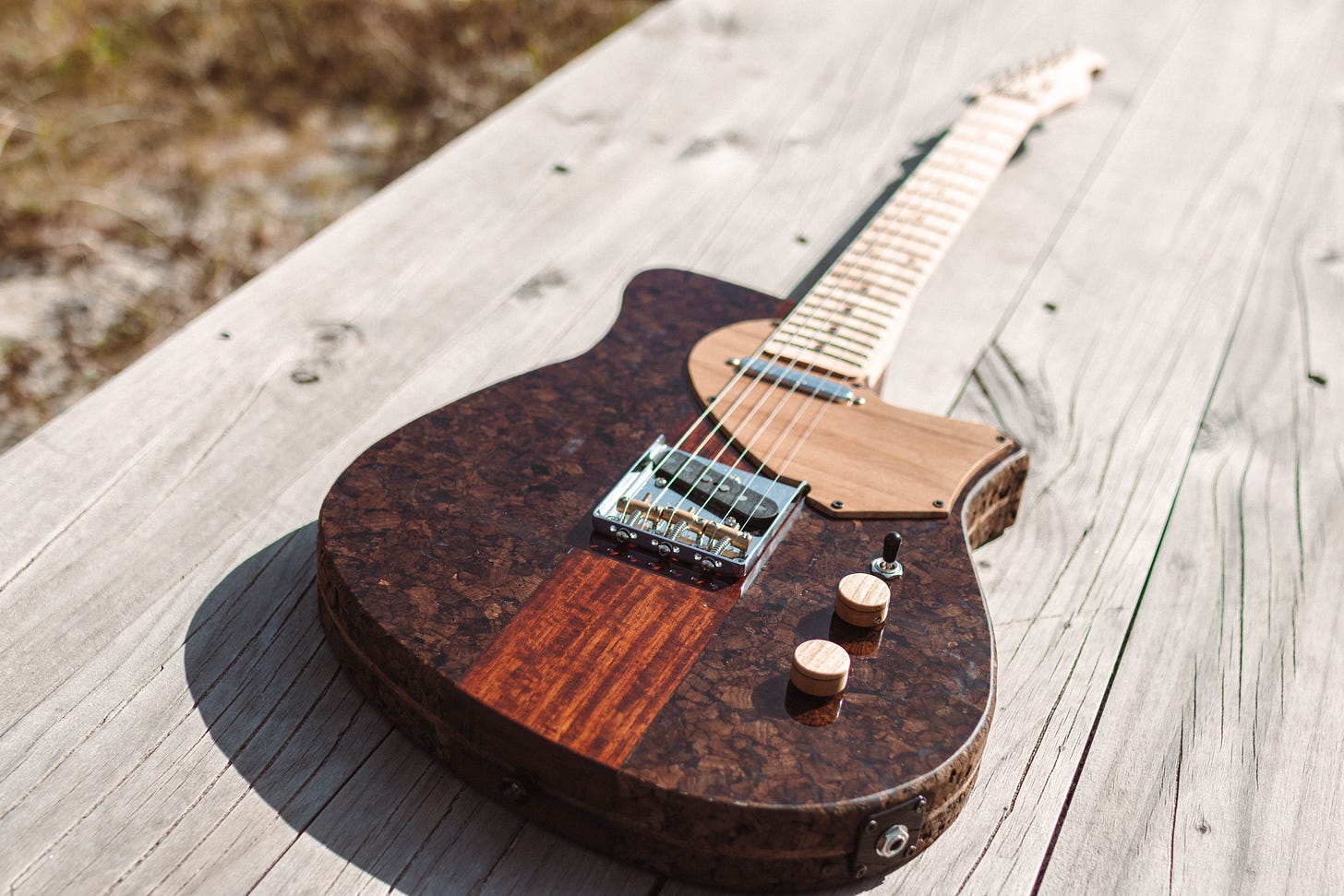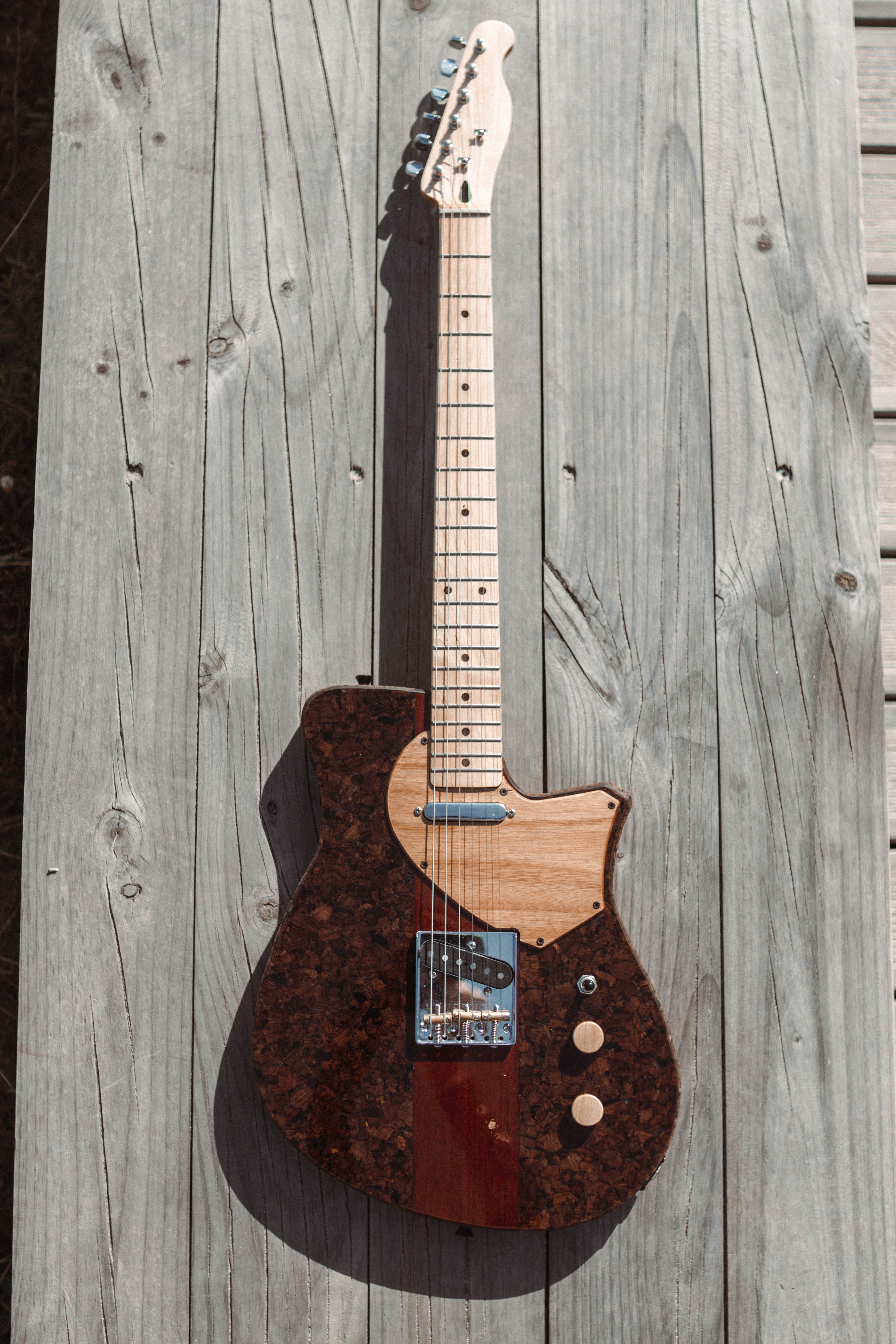 The main material for the creation of this guitar is expanded cork, which is made from reused natural cork (such as cork stoppers), and is normally used as a coating and thermal insulation in buildings. The remaining 25% of this unique guitar is reclaimed wood used for the arm and the center of the body, resulting in a lighter and more ecological instrument.