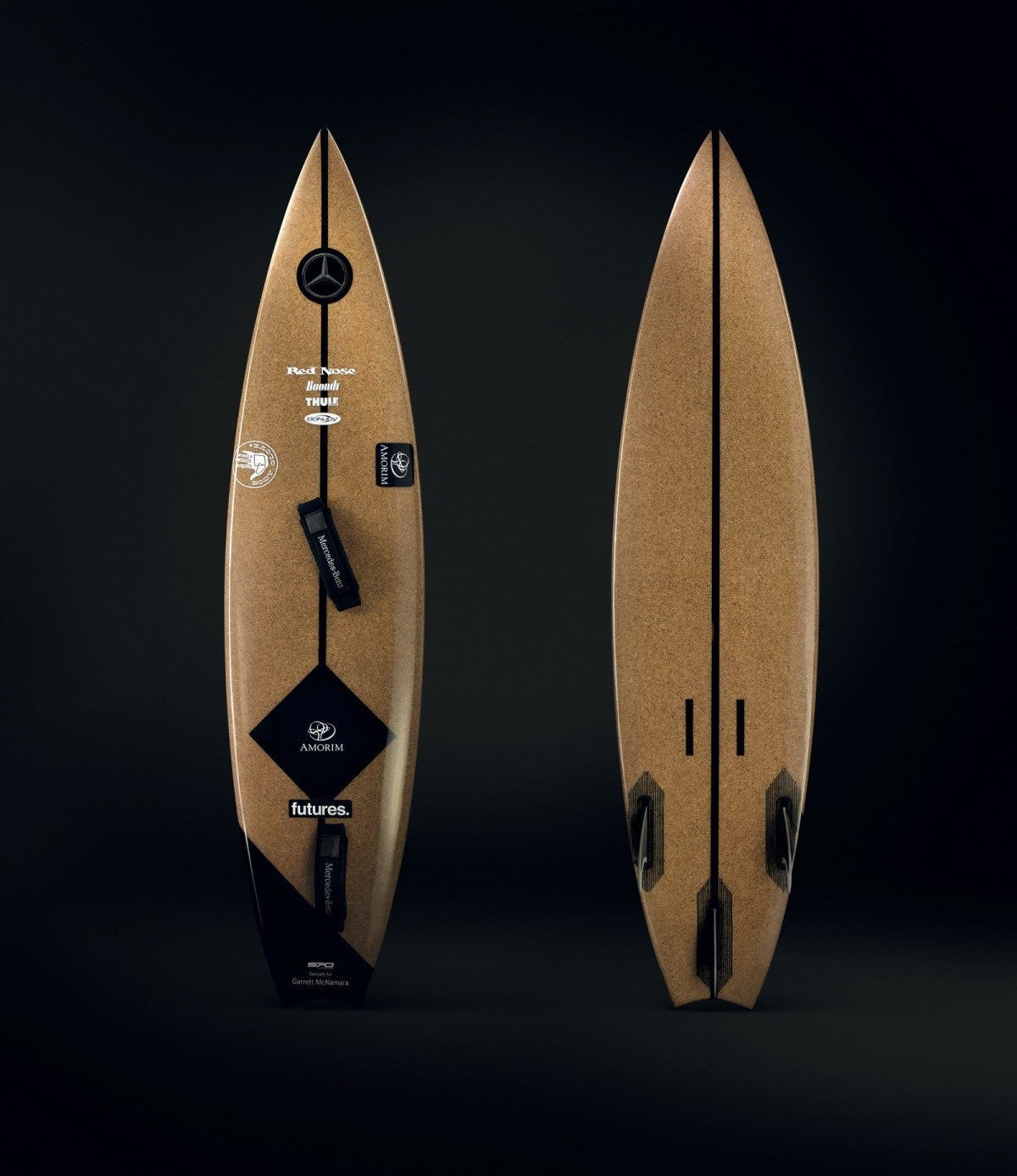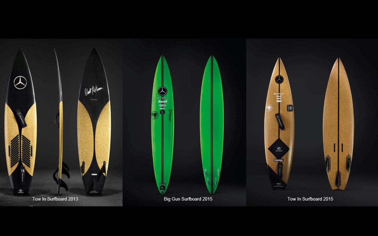 This project was launched in 2013 with a view to designing high-efficiency surfboards making use of Portuguese raw materials and technology, thus enabling Garrett McNamara to face the most extreme surfing conditions that exist in Nazaré. In this context, at Garrett McNamara's own request, a project in partnership with Mercedes-Benz and Amorim Cork Composites was started in the last quarter of 2014