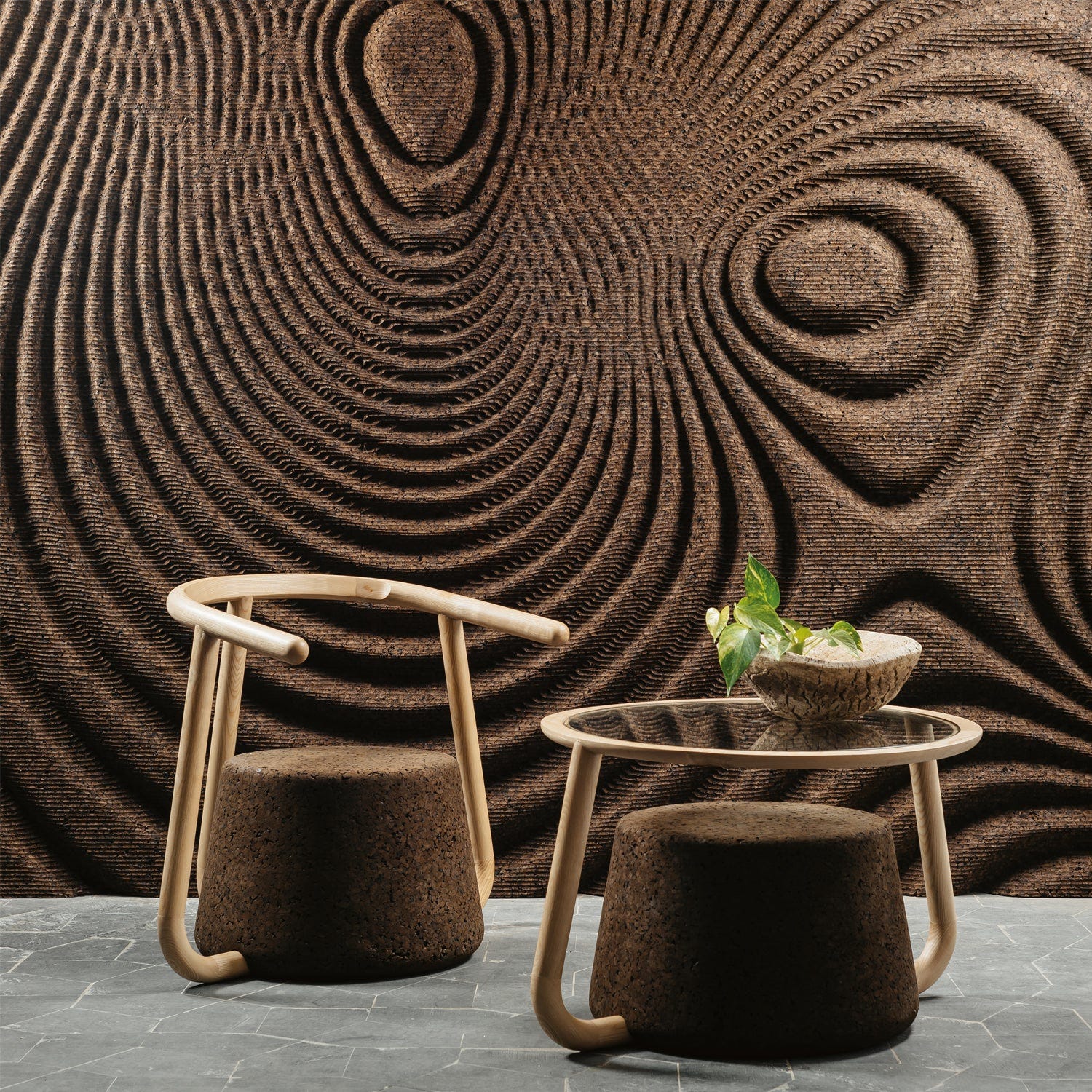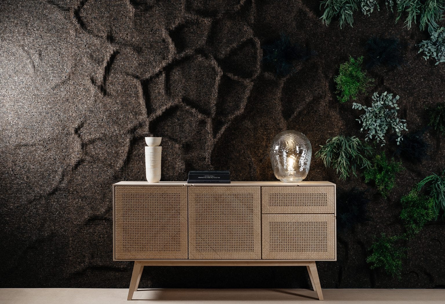 GENCORK, with the creative direction of SPECTROOM, creates mostly panels in expanded cork agglomerate that are used for acoustic coating, have a 3D effect, and can be customized, exploring a low-tech ecological material and high-tech manufacturing processes. “The expanded cork agglomerate is transformed through computational algorithms based on generative design, with strong inspiration in biology, mathematics, and geometry. The development of cork panels explores the industrial digital manufacturing processes, opening up a new spectrum of possibilities and generating a new formal aesthetic. This creative system not only optimizes the thermal and acoustic properties of cork but also adds artistic value.