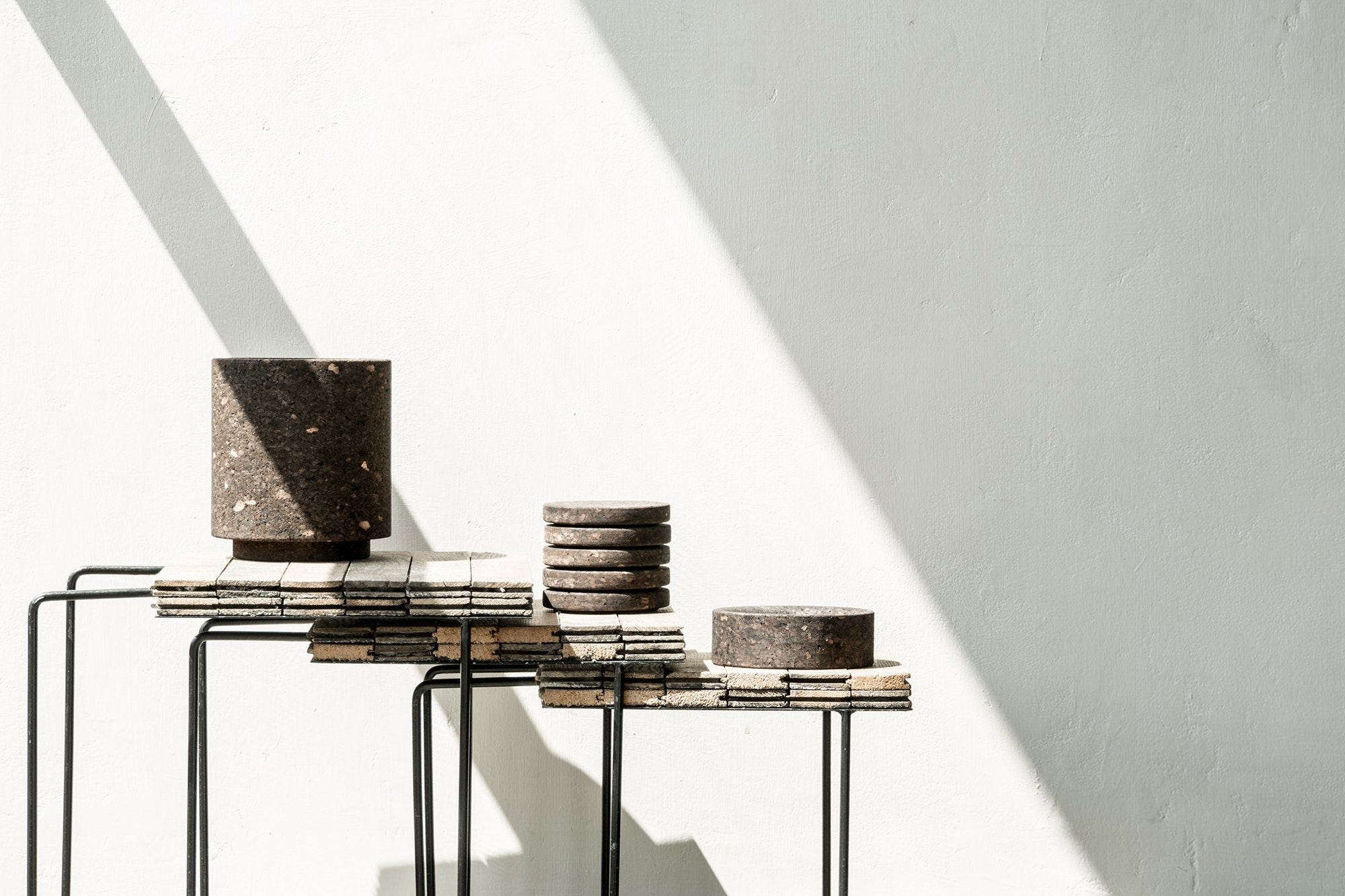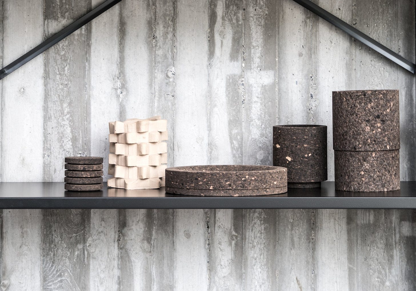 They are currently developing their own type of cork agglomerate, made from compressed, burned cork bark, and are using it to create temporary architecture installations and home design pieces.